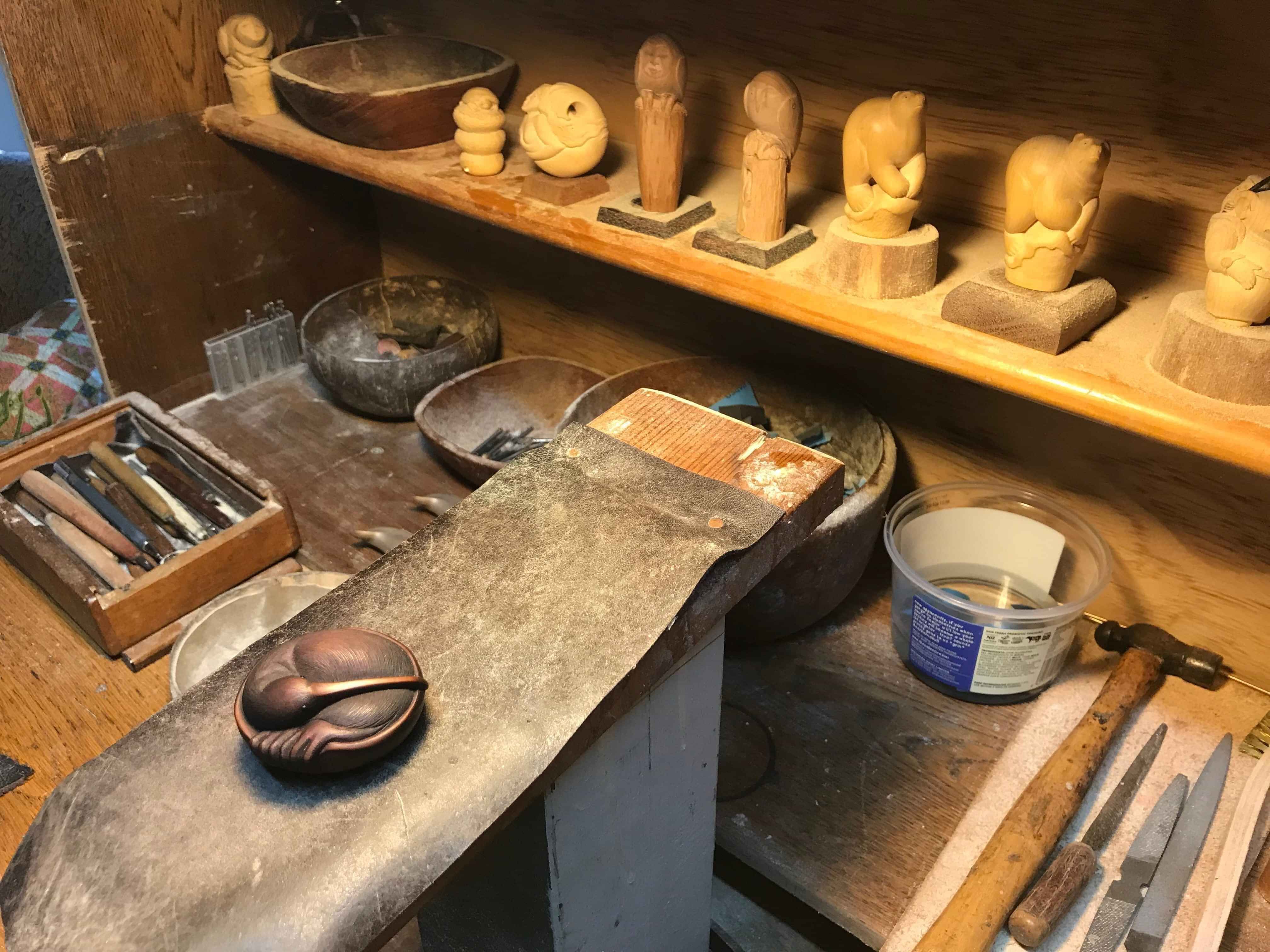 Working on several carvings simultaneously, he will switch between them to remain focused.