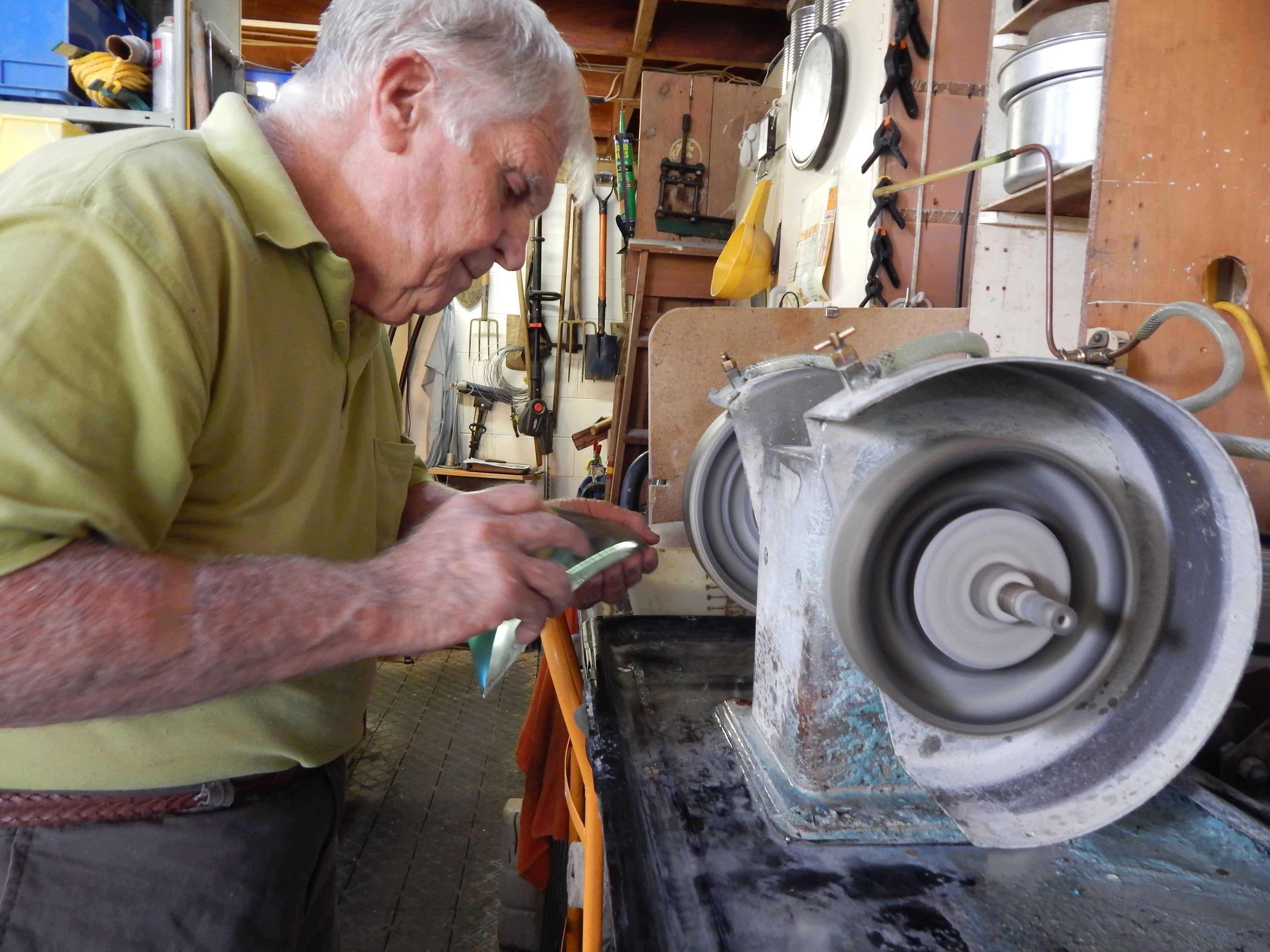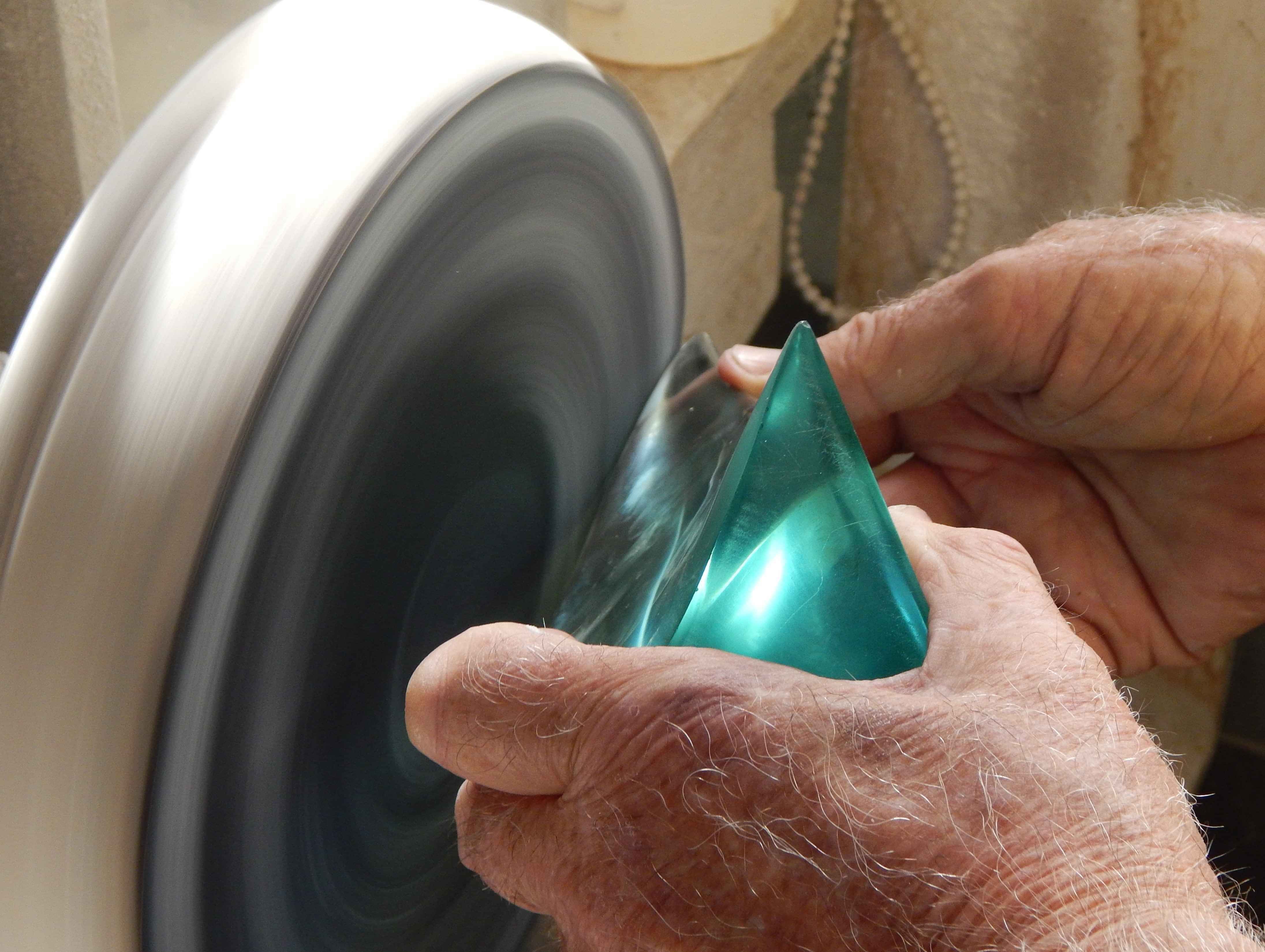 Holding the rough material by hand, he brings it to grinding wheels to achieve initial form, before finishing the surface smooth with increasingly fine abrasives.