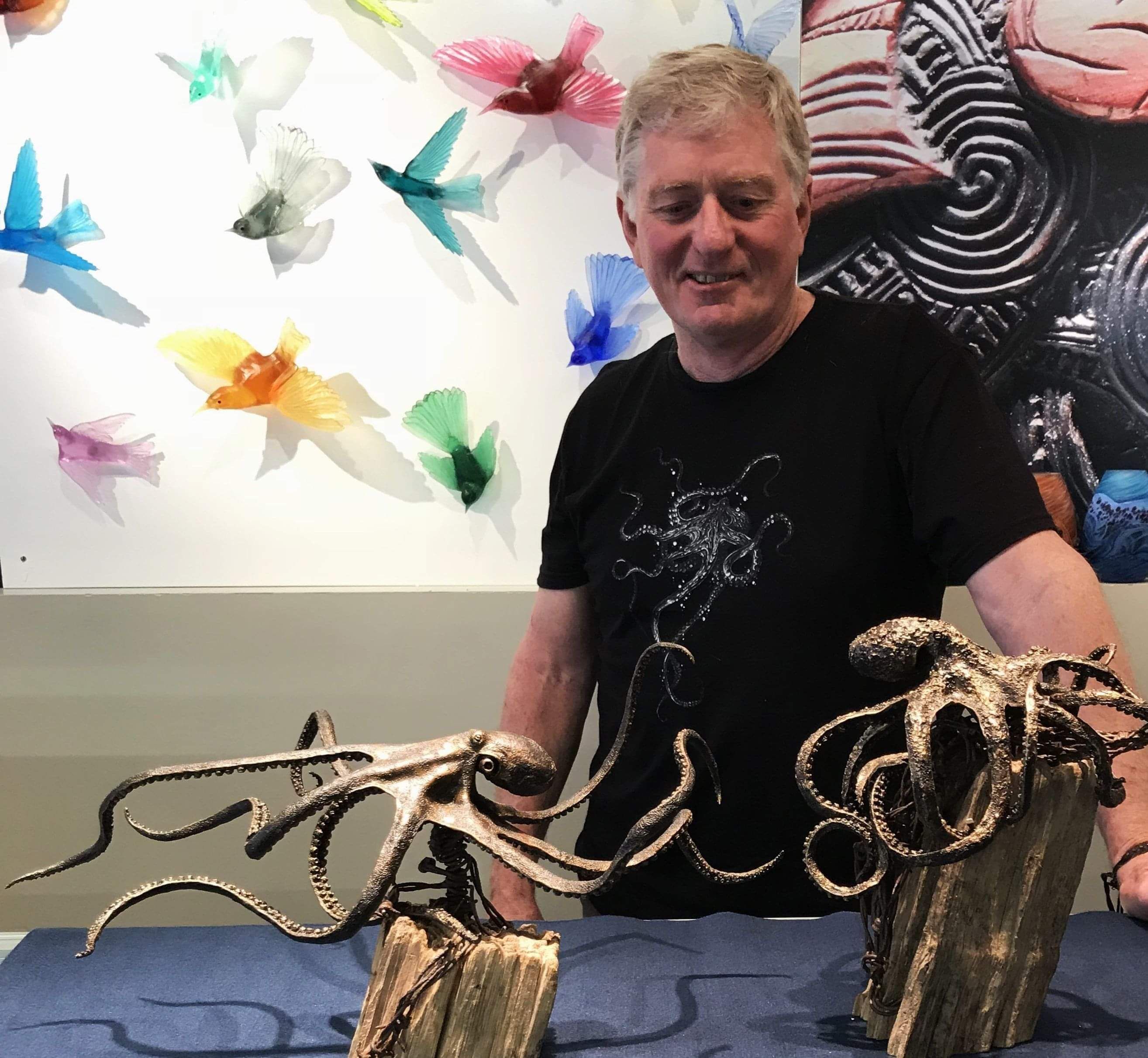 Ken Auton qualified as a jeweller in the mid 1970's, working in Auckland and London, before applying jewellery making techniques to his meticulously detailed bronze wildlife sculptures. New Zealand fauna, such as the 'Weta' insect species and 'Tuatara' reptile are anatomically correct and life like. Humpback Whales and Pacific Octopus sculptures are fluid, animated studies of these fantastic creatures from the ocean domain. At his tranquil rural workshop north of Auckland, with his wife Carol's encouragement, these collectable bronzes are produced in limited numbers.
