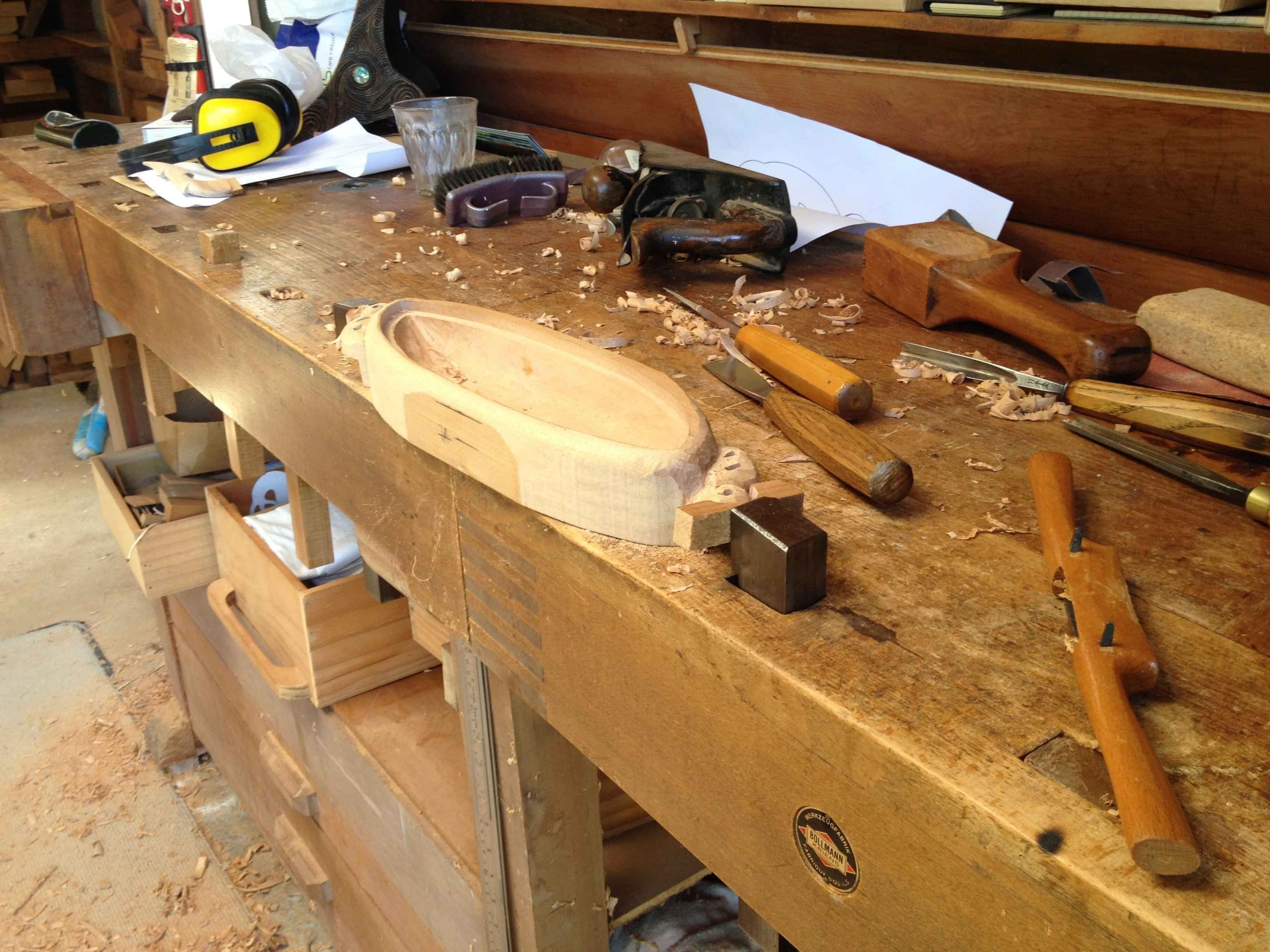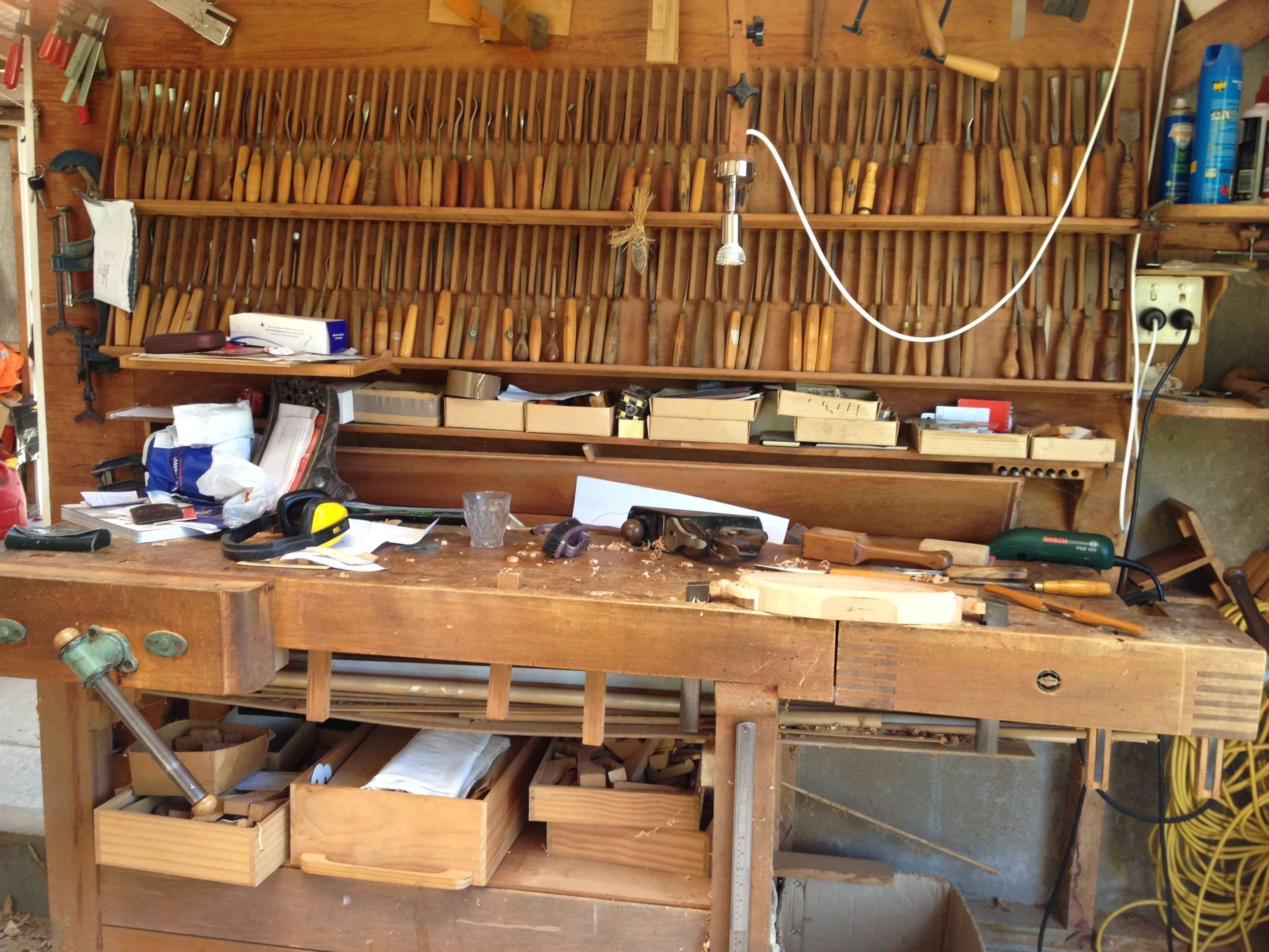 Rangi Redman's home based workshop housed an impressive collection of treasured wood working tools obtained over his lifetime. He carved on a dedicated bench that he purchased from Europe during travels early in his career.