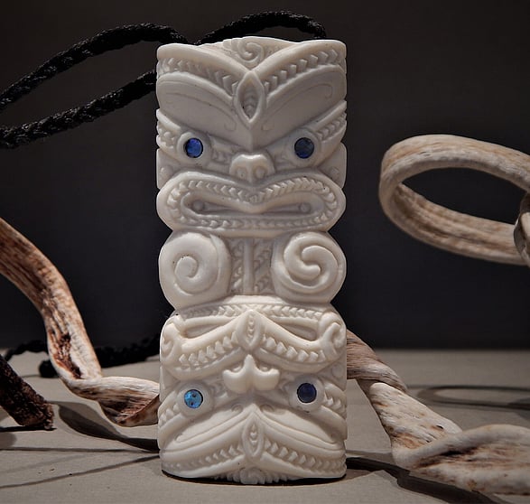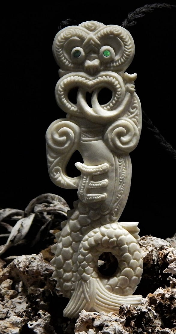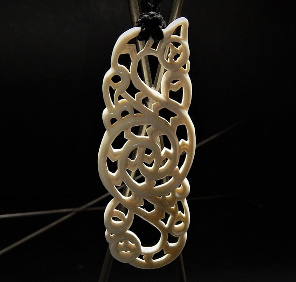 Bone Carving relies on clean and sound material that is carefully processed by the carver to remove any impurities. Bone for carving can easily be sourced as a by-product of New Zealand's dairy industry, or in rare instances sun bleached and weathered whale bone can be found on our coastline, the remnants of whale stranding. Rangi Wills knowledge of traditional Maori design informs his sketching directly onto the material to be carved. The carving is performed with fine tools, including saws, chisels, and fine electric burrs. Iridescent Paua Shell is inlaid into the carving to accentuate the eyes, and finally a platted cord is fitted to enable the piece to be worn.
