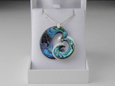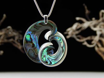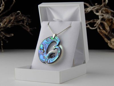 Two tone carved Mother of Pearl and Paua shell pendant hand made in Auckland by Neil Hanna. Featuring West Australian white Mother of Pearl and New Zealand Paua Shell. Dimensions 50 x 43mm. Sterling silver. Sterling silver chain 45cm (17.5 inches). Signed NH by the artist.