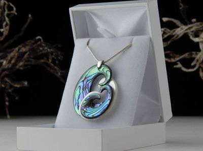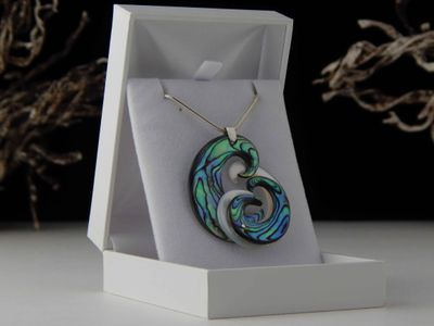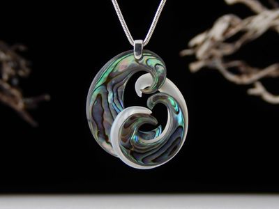 Two tone carved Mother of Pearl and Paua shell pendant hand made in Auckland by Neil Hanna. Featuring West Australian white Mother of Pearl and New Zealand Paua Shell. Dimensions 49 x 37mm. Sterling silver. Sterling silver chain 45cm (17.5 inches). Signed NH by the artist.