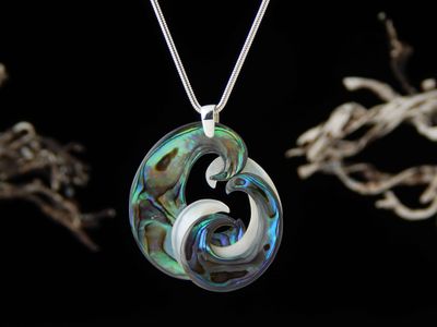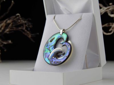 Two tone carved Mother of Pearl and Paua shell pendant hand made in Auckland by Neil Hanna. Featuring West Australian white Mother of Pearl and New Zealand Paua Shell. Dimensions 49 x 40mm. Sterling silver. Sterling silver chain 45cm (17.5 inches). Signed NH by the artist.