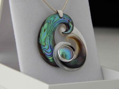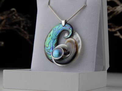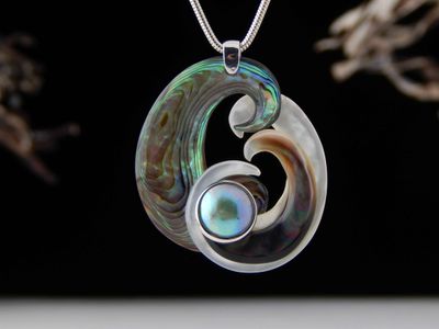 Carved Mother of Pearl and Paua Pearl pendant hand made in Auckland by Neil Hanna. Featuring West Australian white Mother of Pearl, Tahitian black Mother of Pearl, New Zealand Paua Shell, and cultured New Zealand Paua Pearl 11mm diameter. Pendant dimensions 47 x 38mm. Sterling silver. Sterling silver chain 45cm (17.5 inches). Signed NH by the artist.