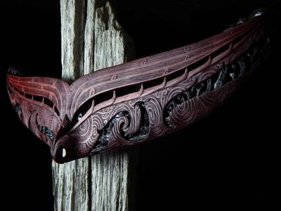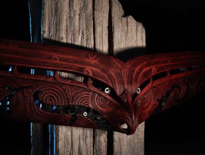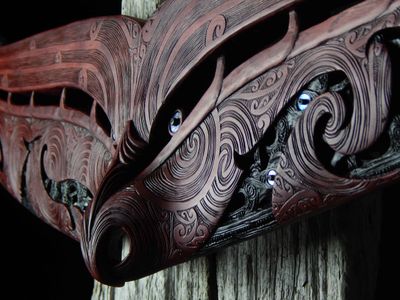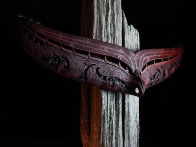 Hokioi ( Haast's Eagle ) carving/mask by John Collins. Free hand carved in New Zealand Kauri wood, stained in two tones, inlaid with Paua Shell. 1m x 255mm (39 x 10 inches) W x H. Price is for the carving only.