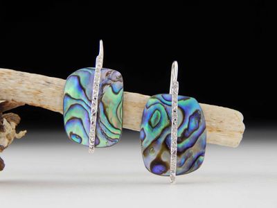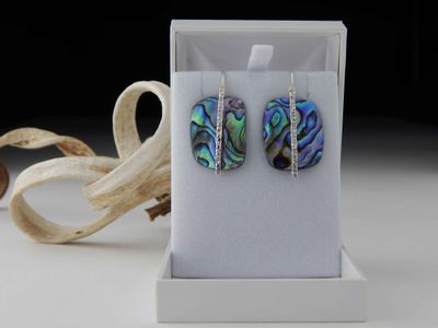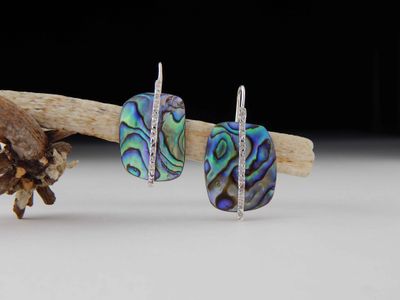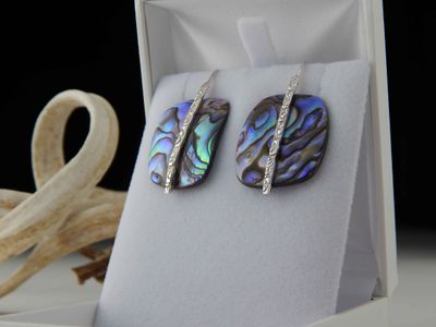 Paua Shell earrings hand made in Auckland by Michel Girardin. Featuring free form New Zealand Paua shell. Sterling silver mounts. Overall length 40mm.