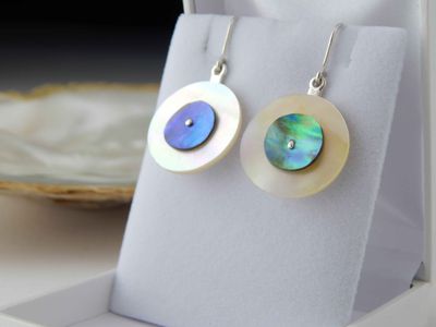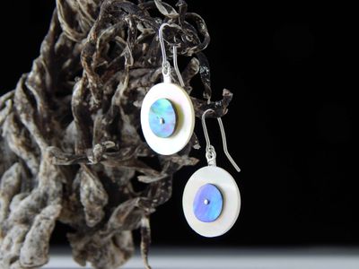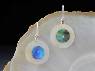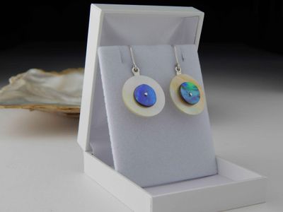 Paua Shell and Mother of Pearl earrings hand made in Auckland by Michel Girardin. Featuring New Zealand Paua shell and West Australian Mother of Pearl shell. Sterling silver mounts. Overall length 41mm.