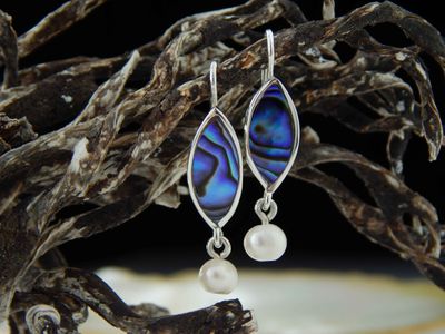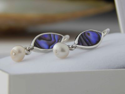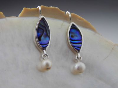 Paua Shell earrings hand made in Auckland by Michel Girardin. Featuring New Zealand Paua shell and cultured pearls. Sterling silver mounts. Overall length 36mm.