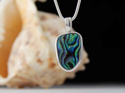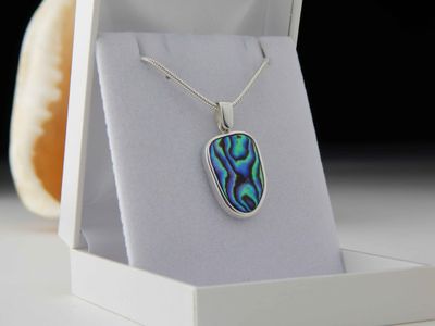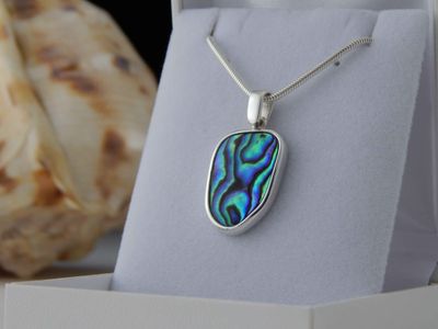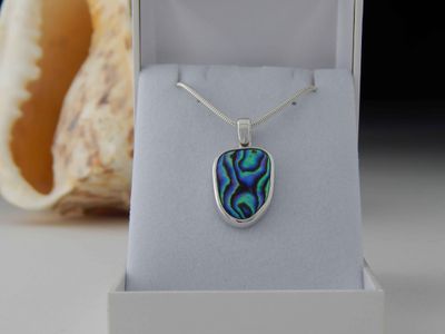 Paua Shell pendant hand made in Auckland by Michel Girardin. Featuring free form New Zealand Paua shell. Sterling silver mount. Pendant overall length 32mm. Sterling silver snake chain 45cm (17.5 inches).