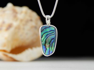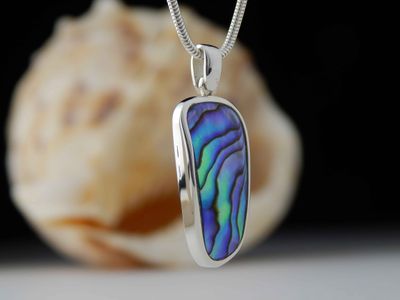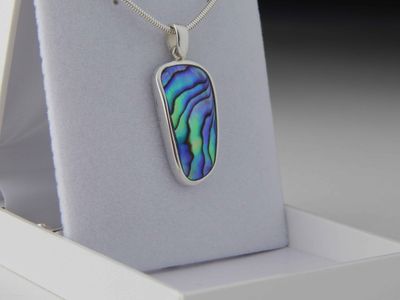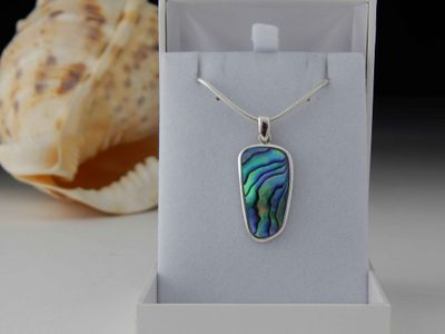 Paua Shell pendant hand made in Auckland by Michel Girardin. Featuring free form New Zealand Paua shell. Sterling silver mount. Pendant overall length 36mm. Sterling silver snake chain 45cm (17.5 inches).