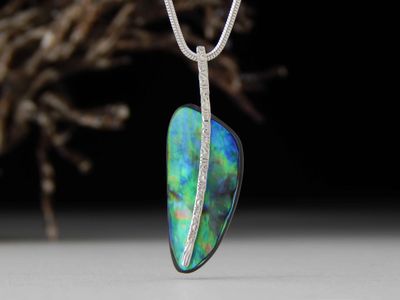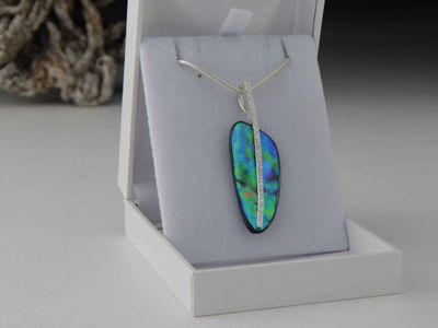 Paua Shell pendant hand made in Auckland by Michel Girardin. Featuring free form New Zealand Paua shell. Sterling silver mount. Pendant overall length 48mm. Sterling silver snake chain 45cm (17.5 inches).