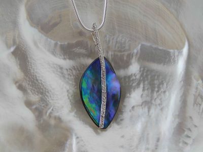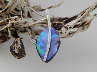 Paua Shell pendant hand made in Auckland by Michel Girardin. Featuring free form New Zealand Paua shell. Sterling silver mount. Pendant overall length 47mm. Sterling silver snake chain 45cm (17.5 inches).