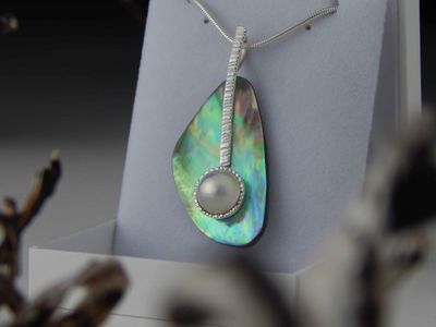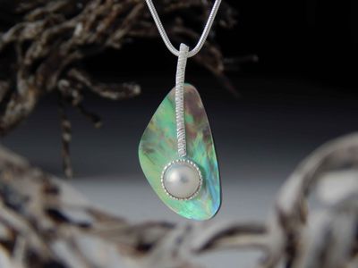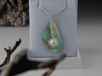 Mabe pearl pendant hand made in Auckland by Michel Girardin. Featuring white Mabe pearl and New Zealand Paua shell. Sterling silver mount. Pendant overall length 52mm. Sterling silver snake chain 45cm (17.5 inches).