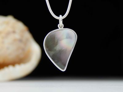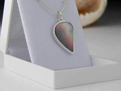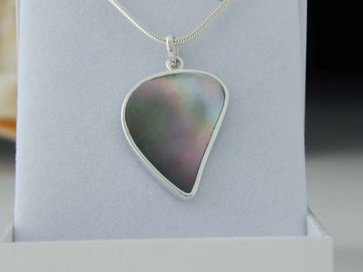 Tahitian Black Mabe pearl pendant hand made in Auckland by Michel Girardin. Featuring free form cultured 'Mabe' pearl. Sterling silver mount. Pendant overall length 37mm. Sterling silver snake chain 45cm (17.5 inches).