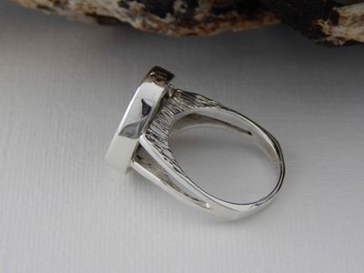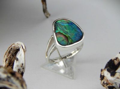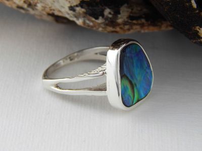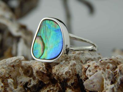 Paua Shell ring hand made in Auckland by Michel Girardin. Featuring free form New Zealand Paua shell. Sterling silver. Size P (US8). Please note ring cannot be resized.