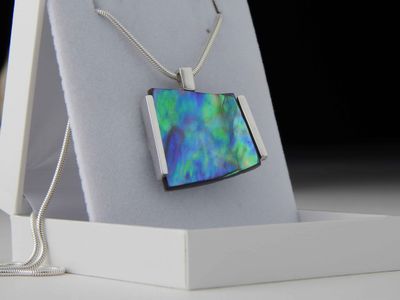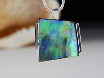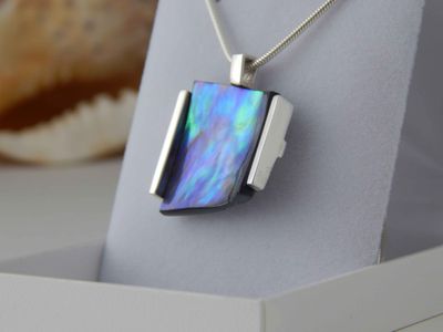 Paua Shell pendant hand made in Auckland by Michel Girardin. Featuring free form New Zealand Paua shell. Sterling silver mount. Pendant overall length 32mm. Sterling silver snake chain 45cm (17.5 inches).