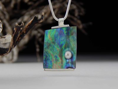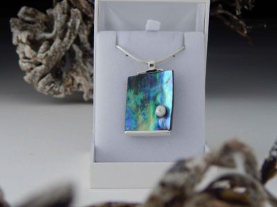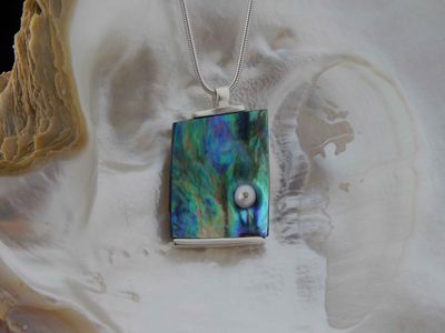 Mabe pearl pendant hand made in Auckland by Michel Girardin. Featuring white Mabe pearl and New Zealand Paua shell. Sterling silver mount. Pendant overall length 42mm. Sterling silver snake chain 45cm (17.5 inches).