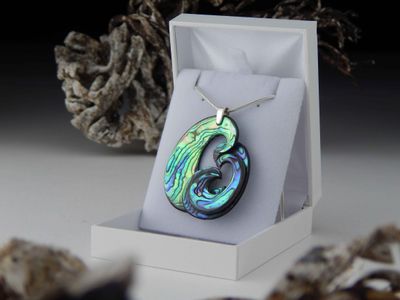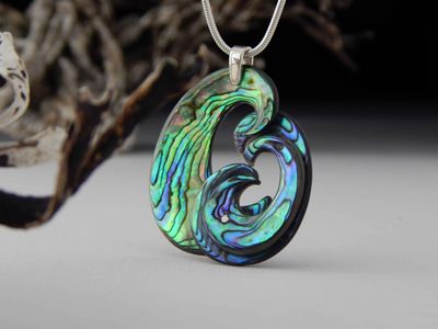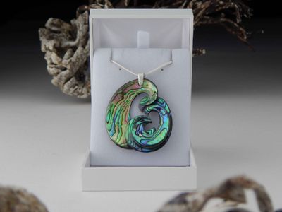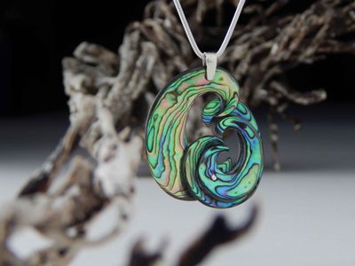 Tone on tone carved Paua shell pendant hand made in Auckland by Neil Hanna. Featuring 3 carved elements of New Zealand Paua Shell. Dimensions 50 x 40mm. Sterling silver. Sterling silver chain 45cm (17.5 inches). Signed NH by the artist.