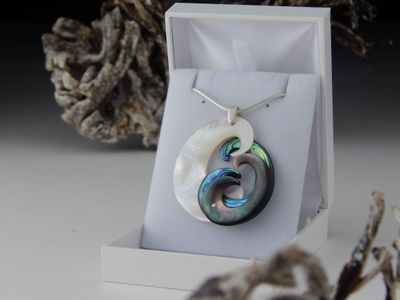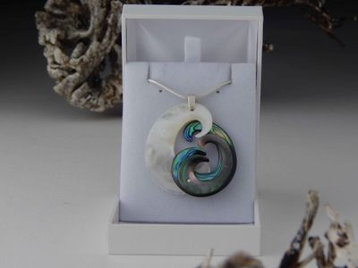 Three tone carved Mother of Pearl and Paua shell pendant hand made in Auckland by Neil Hanna. Featuring West Australian white Mother of Pearl, Tahitian black Mother of Pearl and New Zealand Paua Shell. Dimensions 48 x 40mm. Sterling silver. Sterling silver chain 45cm (17.5 inches). Signed NH by the artist.