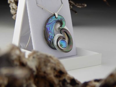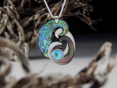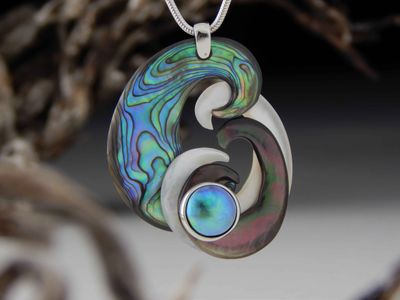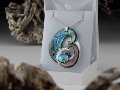 Carved Mother of Pearl and Paua Pearl pendant hand made in Auckland by Neil Hanna. Featuring West Australian white Mother of Pearl, Tahitian black Mother of Pearl, New Zealand Paua Shell, and cultured New Zealand Paua Pearl 11mm diameter. Pendant dimensions 49 x 39mm. Sterling silver. Sterling silver chain 45cm (17.5 inches). Signed NH by the artist.