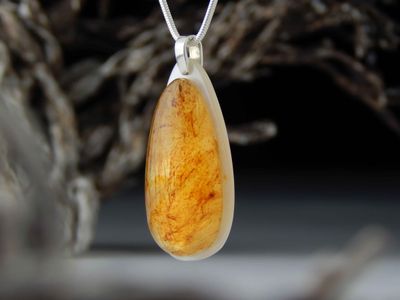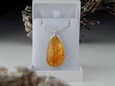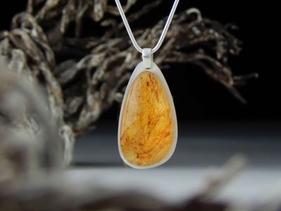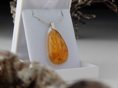 Neil Hanna pendant hand made in Auckland. Featuring New Zealand Kauri Gum and West Australian white Mother of Pearl shell. Overall length 51mm. Sterling silver. Sterling silver snake chain 45cm (17.5 inches). Signed NH by the artist.