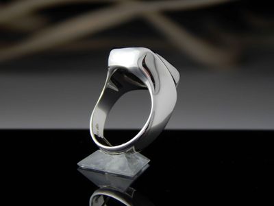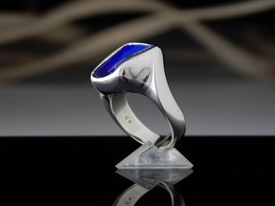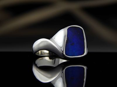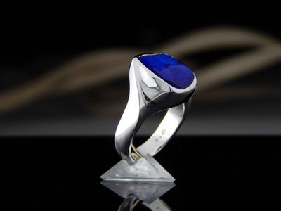 Boulder Opal ring designed and hand made in Auckland for Gallery Pacific. Featuring free form Queensland Boulder Opal gemstone 6.8 carats, 16 x 12mm. Sterling silver mount. Size S (US9.5).