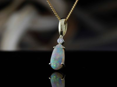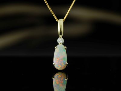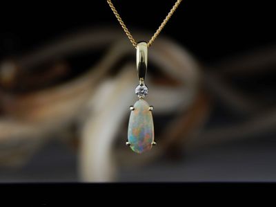 Opal pendant designed and made in Auckland exclusively for Gallery Pacific. Featuring Lightning Ridge Opal gemstone 1.15 carats, 12 x 6mm. Diamond total weight .08 carat. 14ct. gold mount. Pendant overall length 24mm. Gold plated sterling silver chain 45cm (17.5 inches).