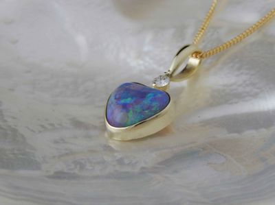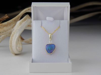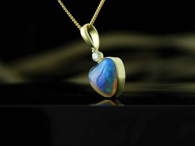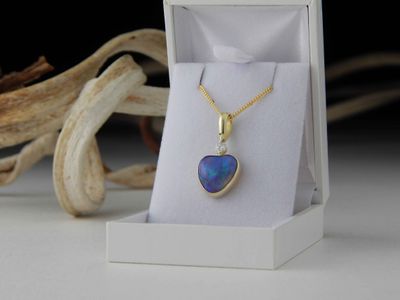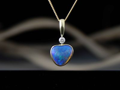 Opal pendant designed and made in Auckland exclusively for Gallery Pacific. Featuring Heart shaped Lightning Ridge Opal gemstone 4.50 carats, 11 x 11 x 6mm. Diamond total weight .12 carat. 14ct. gold mount. Pendant overall length 26mm. Gold plated sterling silver chain 45cm (17.5 inches).