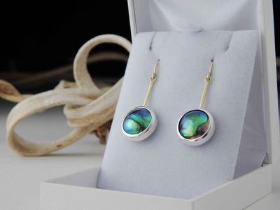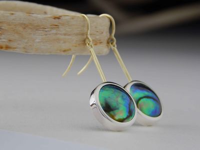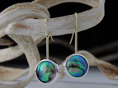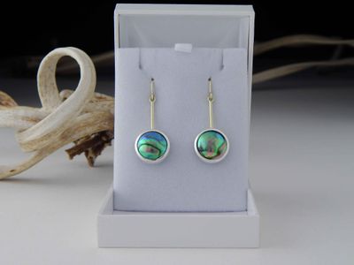 New Zealand Blue Pearl earrings designed and made in Auckland exclusively for Gallery Pacific. Featuring 14mm diameter pearls. Two tone 14ct. yellow gold / sterling silver mounts. Earrings overall length 40mm.