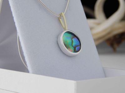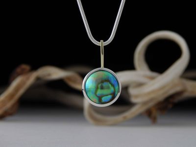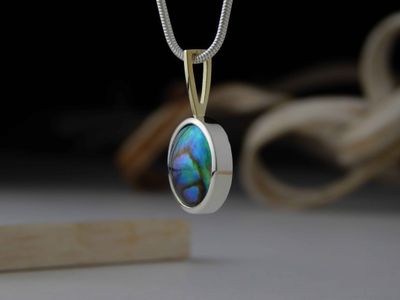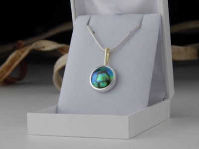 New Zealand Blue Pearl pendant designed and made in Auckland exclusively for Gallery Pacific. Featuring 16mm diameter pearl, cultivated by Eyris Pearls. Two tone 14ct. yellow gold / sterling silver mount. Pendant overall length 29mm. Sterling silver snake chain 45cm.