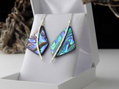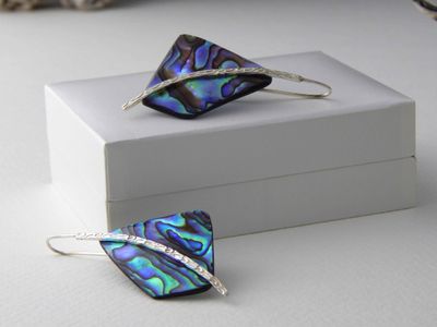 Paua Shell earrings hand made in Auckland by Michel Girardin. Featuring free form New Zealand Paua shell. Sterling silver mounts. Overall length 61mm.