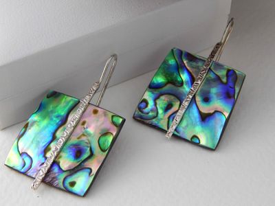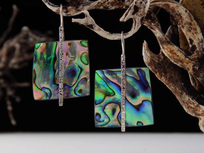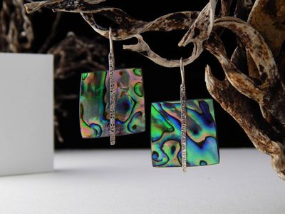 Paua Shell earrings hand made in Auckland by Michel Girardin. Featuring free form New Zealand Paua shell. Sterling silver mounts. Overall length 48mm.