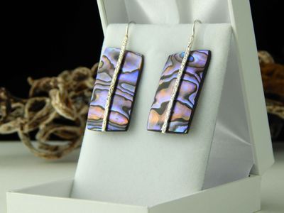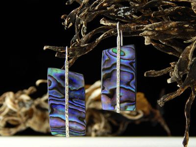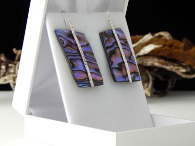 Paua Shell earrings hand made in Auckland by Michel Girardin. Featuring free form New Zealand Paua shell. Sterling silver mounts. Overall length 55mm.