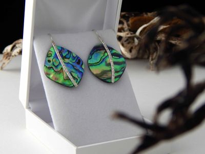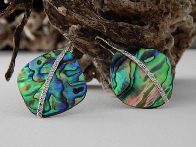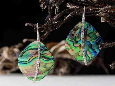 Paua Shell earrings hand made in Auckland by Michel Girardin. Featuring free form New Zealand Paua shell. Sterling silver mounts. Overall length 47mm.