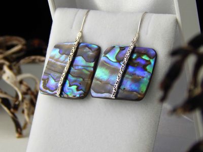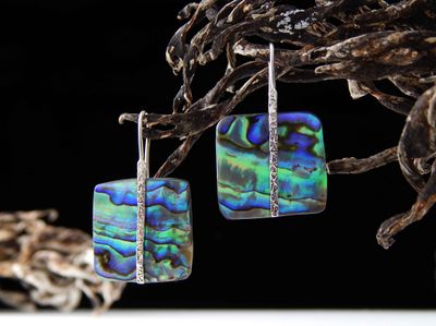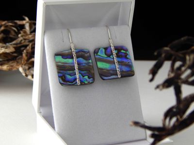 Paua Shell earrings hand made in Auckland by Michel Girardin. Featuring free form New Zealand Paua shell. Sterling silver mounts. Overall length 44mm.