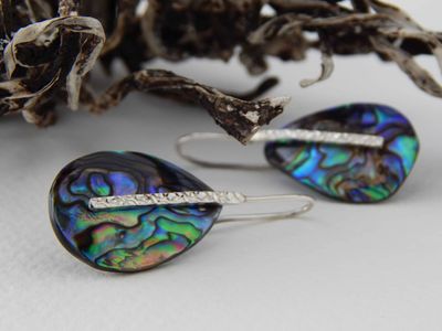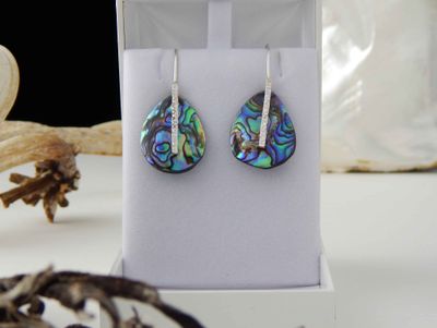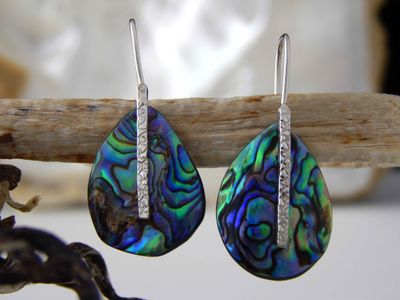 Paua Shell earrings hand made in Auckland by Michel Girardin. Featuring free form New Zealand Paua shell. Sterling silver mounts. Overall length 43mm.