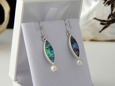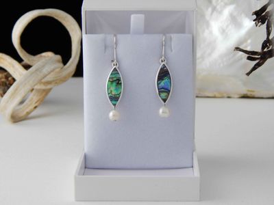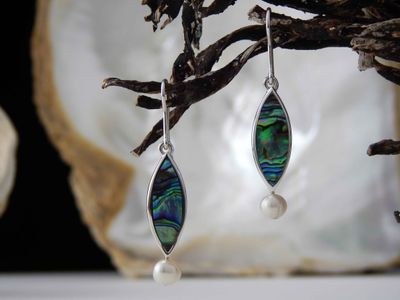 Paua Shell and cultured pearl earrings hand made in Auckland by Michel Girardin. Featuring free form New Zealand Paua shell and cultured Akoya pearls. Sterling silver mounts. Overall length 49mm.
