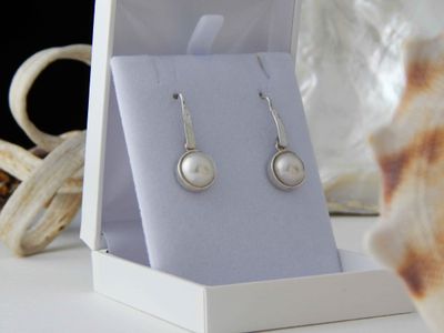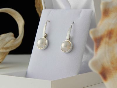 Mabe Pearl earrings hand made in Auckland by Michel Girardin. Featuring cultured Akoya type Mabe Pearls. Sterling silver mounts. Overall length 31mm.