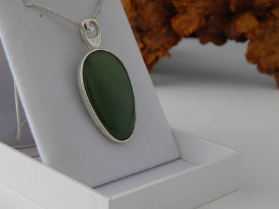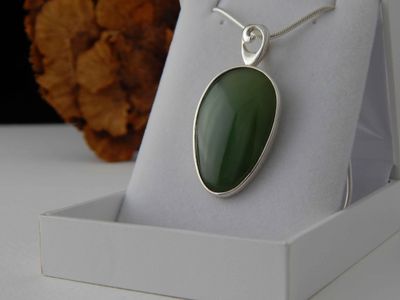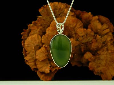 Jade pendant hand made in Auckland by Michel Girardin. Featuring free form Pounamu (New Zealand Nephrite Jade). Sterling silver mount. Pendant overall length 52mm. Sterling silver snake chain 45cm (17.5 inches).