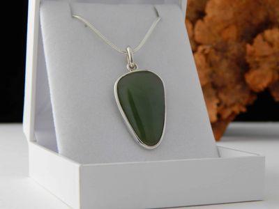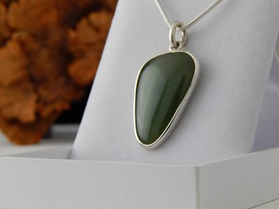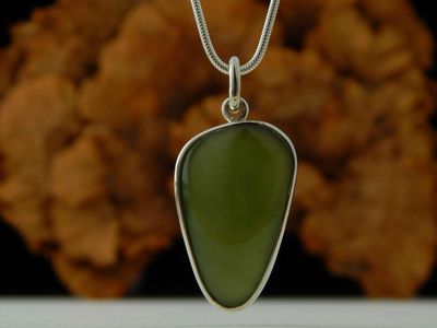 Jade pendant hand made in Auckland by Michel Girardin. Featuring free form Pounamu (New Zealand Nephrite Jade). Sterling silver mount. Pendant overall length 45mm. Sterling silver snake chain 45cm (17.5 inches).