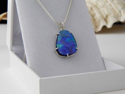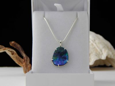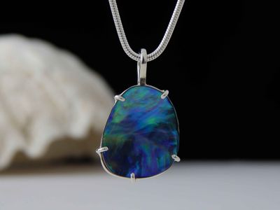 Paua Shell pendant hand made in Auckland by Michel Girardin. Featuring free form New Zealand Paua shell. Sterling silver mount. Pendant overall length 32mm. Sterling silver snake chain 45cm (17.5 inches).