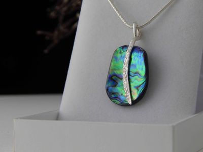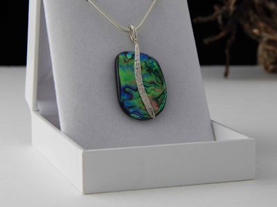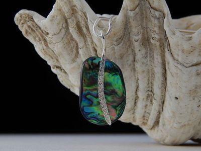 Paua Shell pendant hand made in Auckland by Michel Girardin. Featuring free form New Zealand Paua shell. Sterling silver mount. Pendant overall length 43mm. Sterling silver snake chain 45cm (17.5 inches).