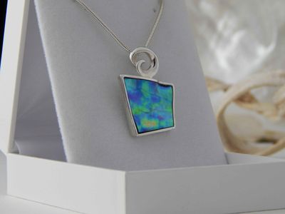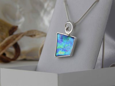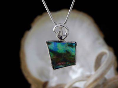 Paua Shell pendant hand made in Auckland by Michel Girardin. Featuring free form New Zealand Paua shell. Sterling silver mount. Pendant overall length 34mm. Sterling silver snake chain 45cm (17.5 inches).