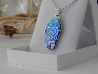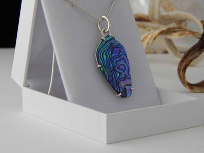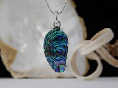 Paua Shell pendant hand made in Auckland by Michel Girardin. Featuring free form New Zealand Paua shell. Sterling silver mount. Pendant overall length 52mm. Sterling silver snake chain 45cm (17.5 inches).