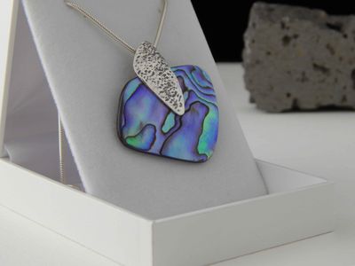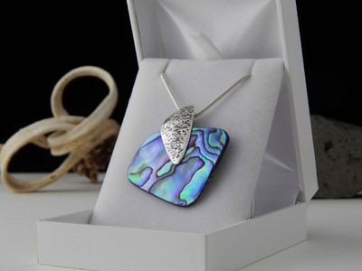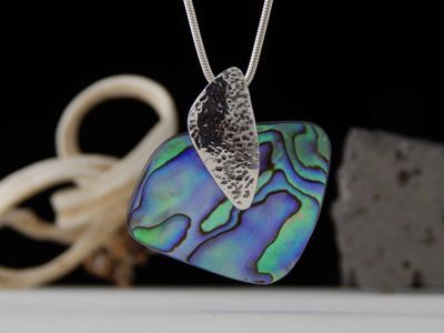 Paua Shell pendant hand made in Auckland by Michel Girardin. Featuring free form New Zealand Paua shell. Sterling silver mount. Pendant overall length 44mm. Sterling silver snake chain 45cm (17.5 inches).