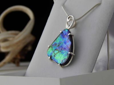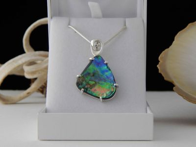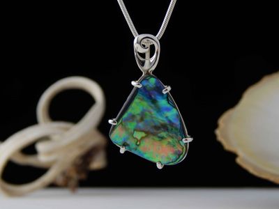 Paua Shell pendant hand made in Auckland by Michel Girardin. Featuring free form New Zealand Paua shell. Sterling silver mount. Pendant overall length 45mm. Sterling silver snake chain 45cm (17.5 inches).