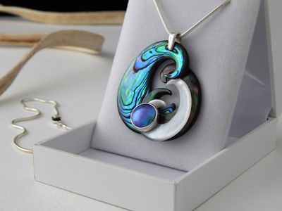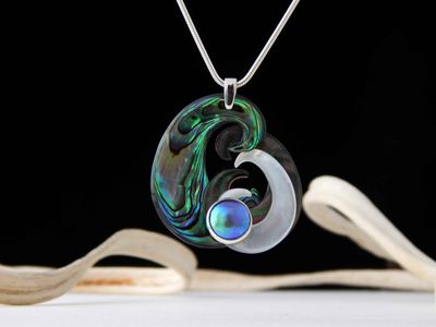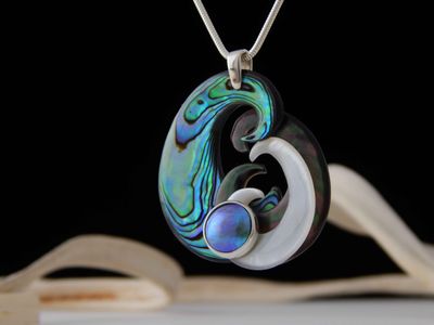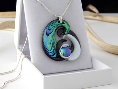 Carved three tone Mother of Pearl and Paua Pearl pendant hand made in Auckland by Neil Hanna. Featuring West Australian white Mother of Pearl, Tahitian black Mother of Pearl, New Zealand Paua Shell and cultured New Zealand Paua Pearl 11mm diameter. Overall length 48mm. Sterling silver. Sterling silver chain 45cm (17.5 inches). Signed NH by the artist.