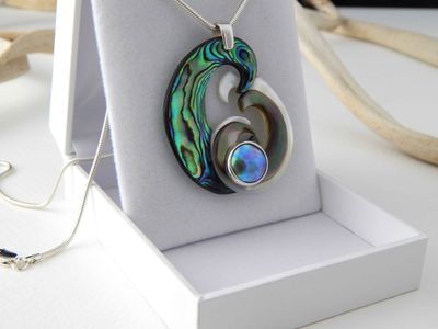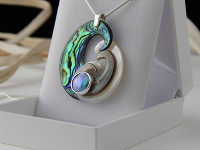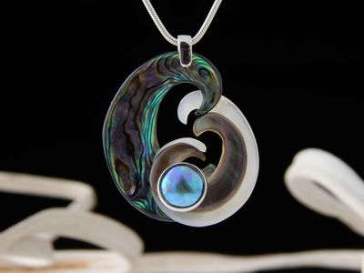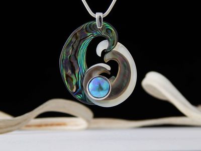 Carved three tone Mother of Pearl and Paua Pearl pendant hand made in Auckland by Neil Hanna. Featuring West Australian white Mother of Pearl, Tahitian black Mother of Pearl, New Zealand Paua Shell and cultured New Zealand Paua Pearl 11mm diameter. Overall length 49mm. Sterling silver. Sterling silver chain 45cm (17.5 inches). Signed NH by the artist.