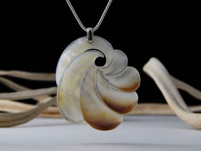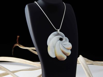 Carved Mother of Pearl pendant hand made in Auckland by Neil Hanna. Featuring West Australian white Mother of Pearl Shell. Overall length 62mm. Sterling silver. Sterling silver chain 45cm (17.5 inches). Signed NH by the artist.